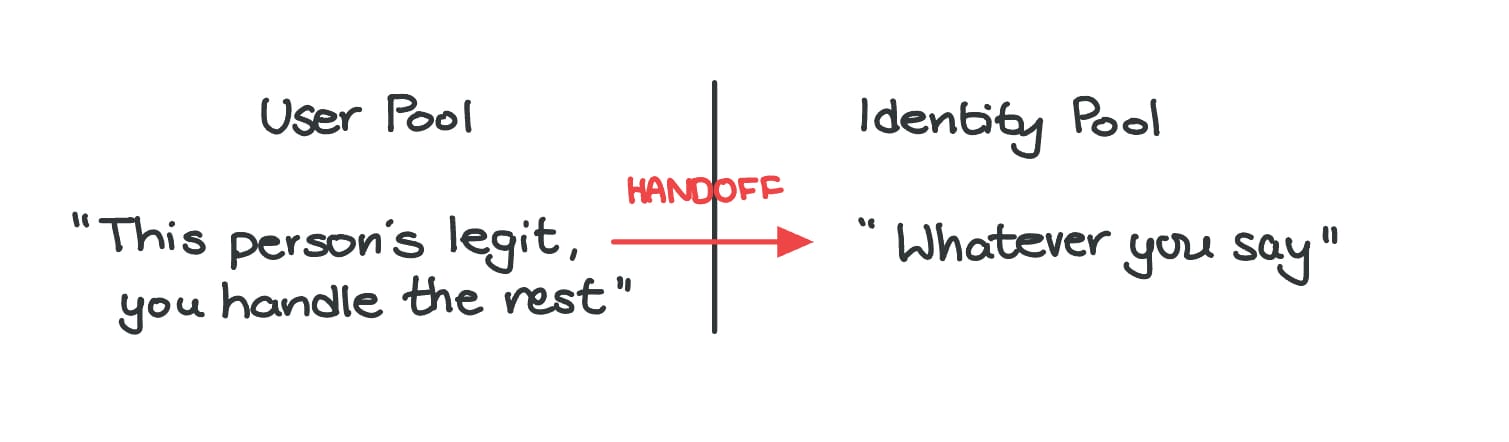So yes, even though both services are part of “Cognito,” they operate independently. And because the Identity Pool is just receiving a token from somewhere else (even if that “somewhere else” is within AWS, within Cognito), that identity is federated from the Identity Pool’s point of view. It’s external from the Cognito Identity Pool’s POV.